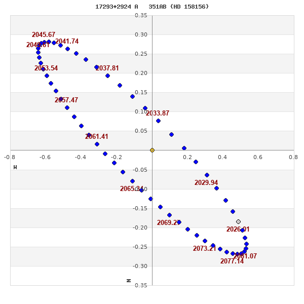 HO 581 AB: 508; 667x: Very subtly notched elongation at best, light orange stars. 25.63 year period, near apastron in a nearly circular orbit, it will widen slightly in the next 5 years and still be a detectable 0.2" in 2035.